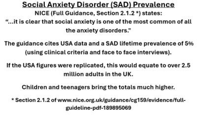 The NICE Social Anxiety Guidance (Full Guidance 2013) states there are no UK epidemiological surveys that specifically report data on social anxiety disorder in adults. However, section 2.1.2 goes on to quote “…it is clear that social anxiety is one of the most common of all the anxiety disorders”.