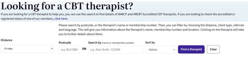 The lead membership organisation for all CBT therapists in the UK is the BABCP (British Association for Behavioural and Cognitive Psychotherapies). They have an online CBT register which can be used to search for therapists which acts as a good starting point to finding one in your local area. The search page looks like this: