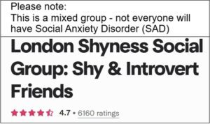 London Shyness Social Group is a long standing and well-respected Meetup group. Whilst not everyone there has social anxiety disorder (SAD) – they are are long standing supporter of social anxiety related issues and the condition is well recognised within their “About” page.